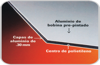 Consta de dos capas de aluminio de 0.4 mm, pintadas con 2 capas de PVDF Fluorocarbono (Kynar500®) de 25 micras y una aleacion de 1,100 con un centro de polietileno (LDPE) de 3.2mm.