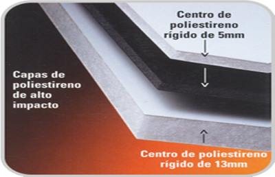 Es un Foam Board de poliestireno extruído entre dos capas de poliestireno de alto impacto. Es ligero, impermeable y resistente a deformaciones, las aplicaciones en vinil pueden ser reposicionadas, sus capas son lisas y de alto impacto.